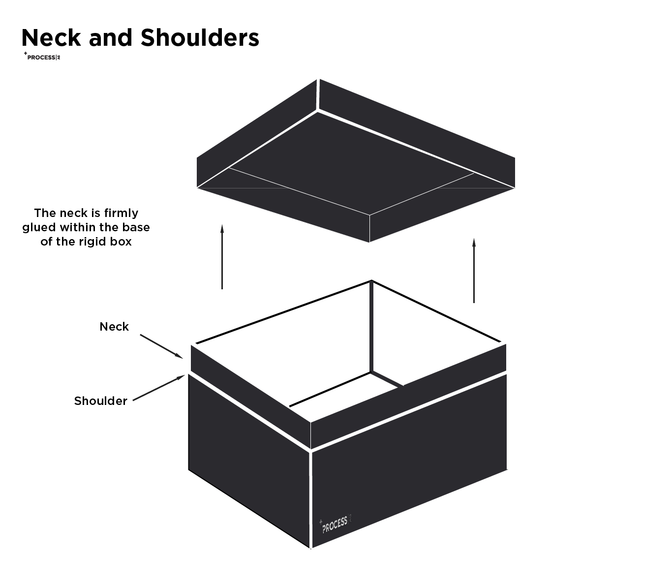 Other variations of the telescoping box include partial telescoping, the classic shoe box, neck and shoulders, and the tray and sleeve box. The most notable of these variations is the neck and shoulders box. Like many of these boxes, its name suggests the form of this box. A portion of the box protrudes from the inner chipboard of the rigid box, this is the “neck” portion. This allows for the rigid box base and its lid to have a flush look that is often desired by many within the custom packaging industry. In some cases, however, the neck is made extra long to create a break between the lid and the base where the “neck” becomes visible. This is done mainly for an aesthetic reason, the neck itself can be colored which adds an additional element of design to the box.